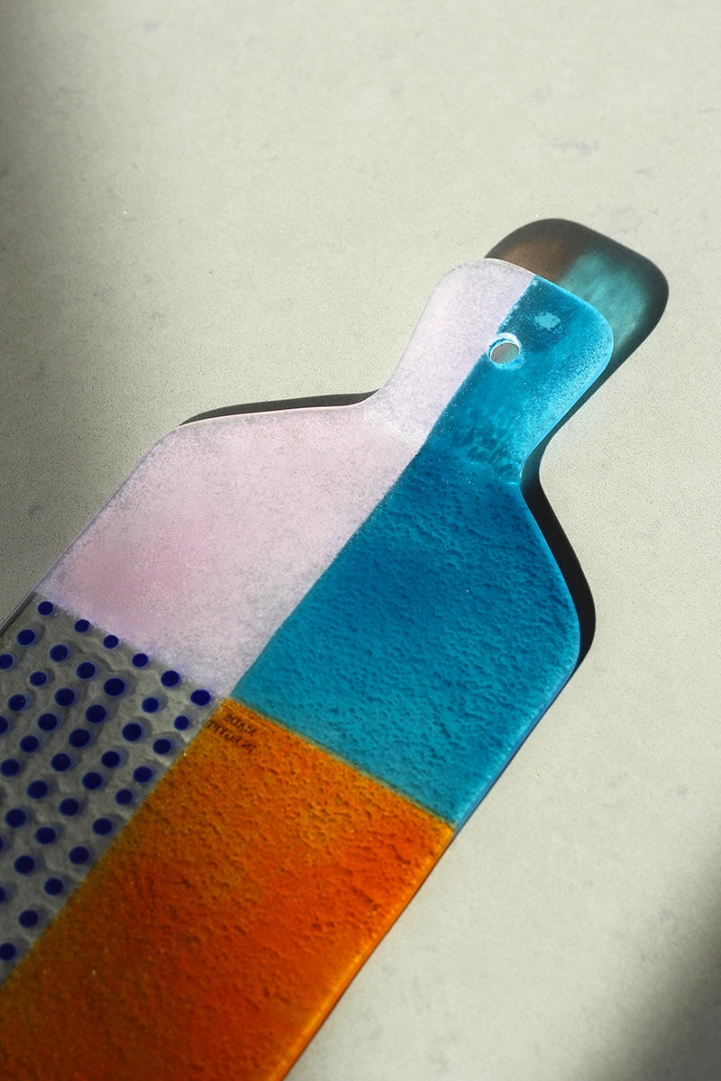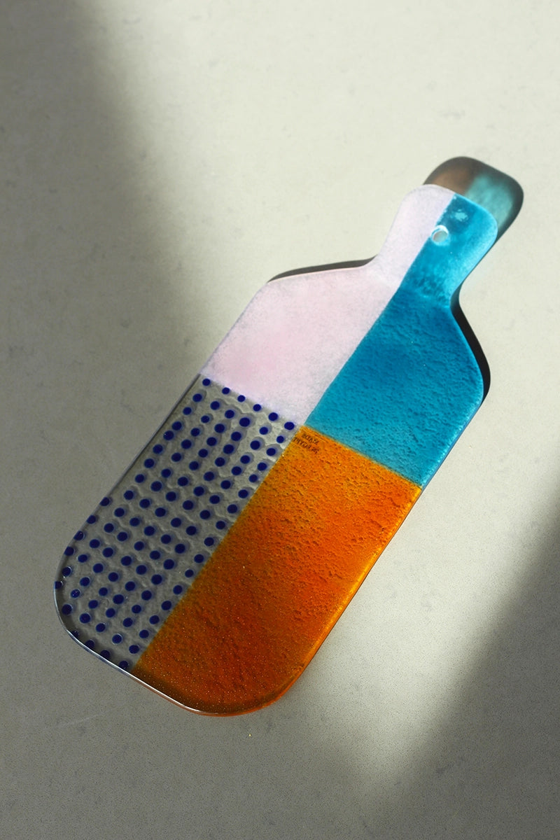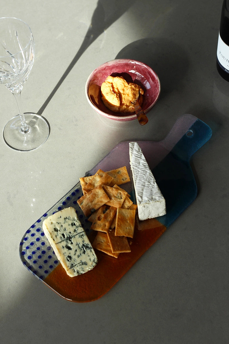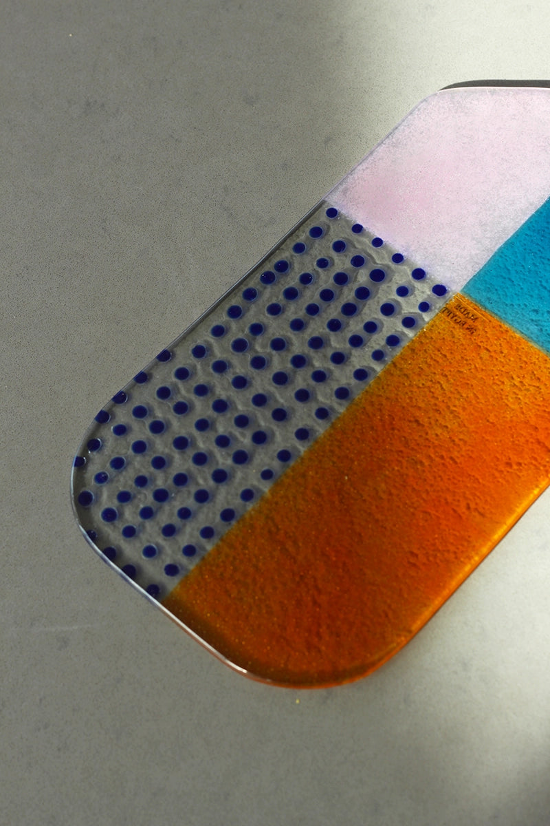 Klein van formaat, groots in uitstraling. Deze kleurrijke borrelplank van Redjekie is gemaakt van handgeblazen glas en bevat een vrolijke mix van oranje, blauw en roze met een speels gestippeld vlak. Voor borrels, ontbijt of gewoon als blikvanger op tafel.