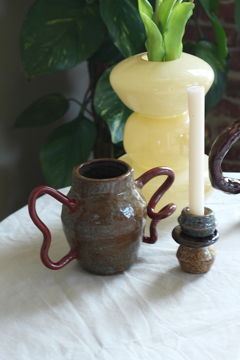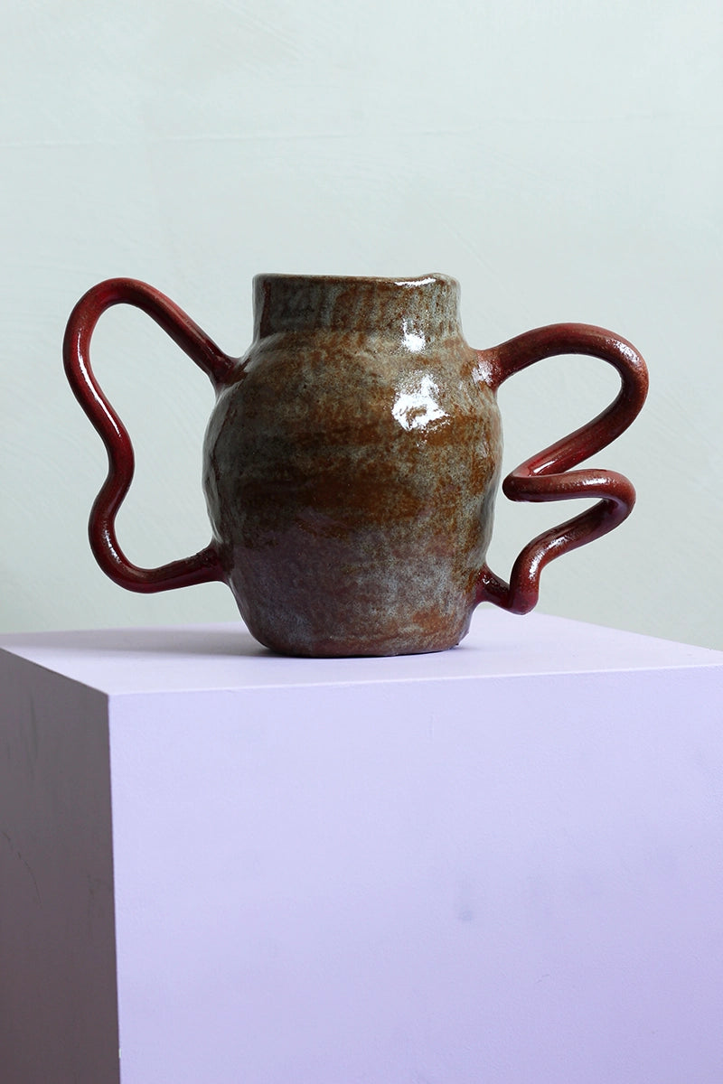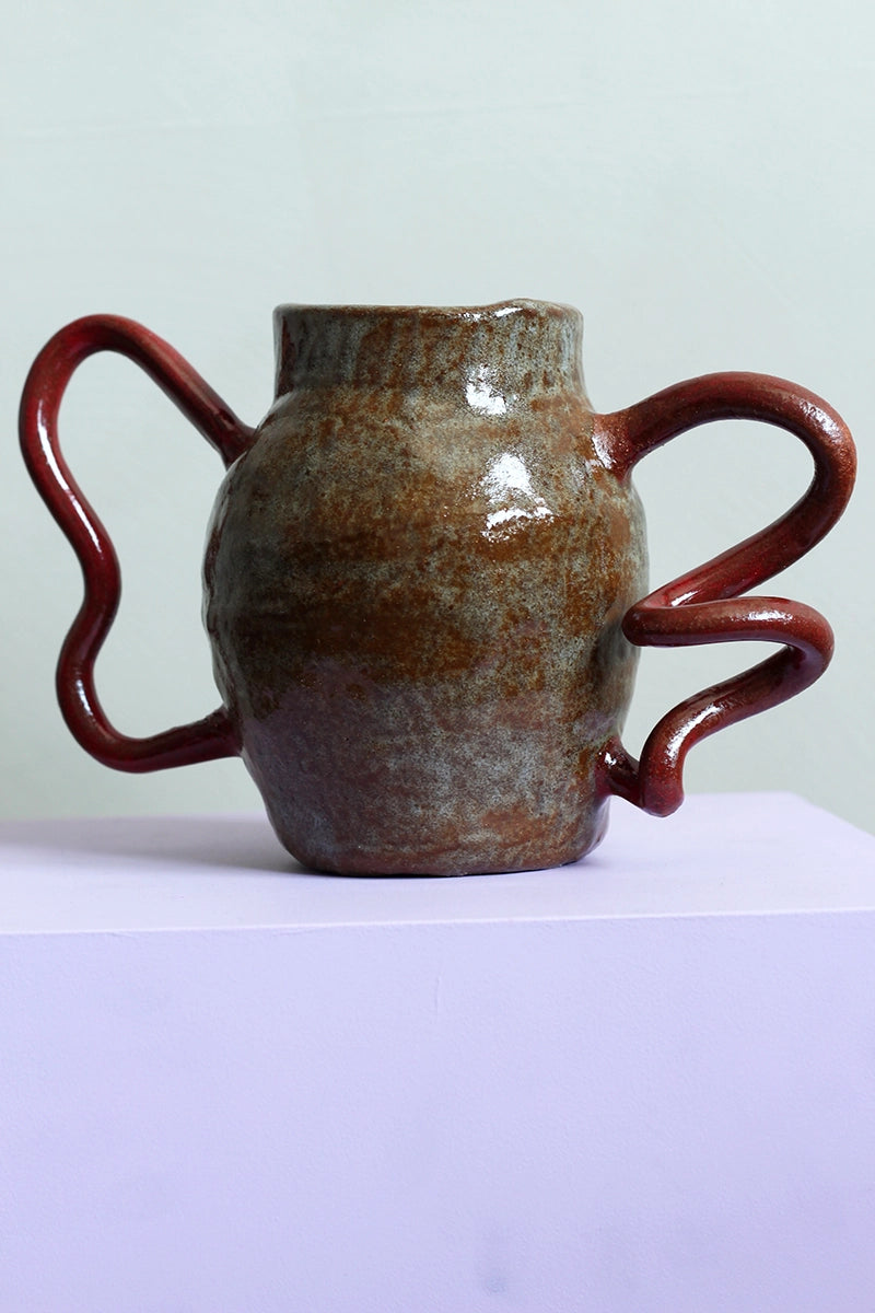 Dit is geen gewone vaas – dit is kunst met karakter. De blauwe kleur en de opvallende rode ‘oren’ maken dit een echte blikvanger. Voor wie durft.