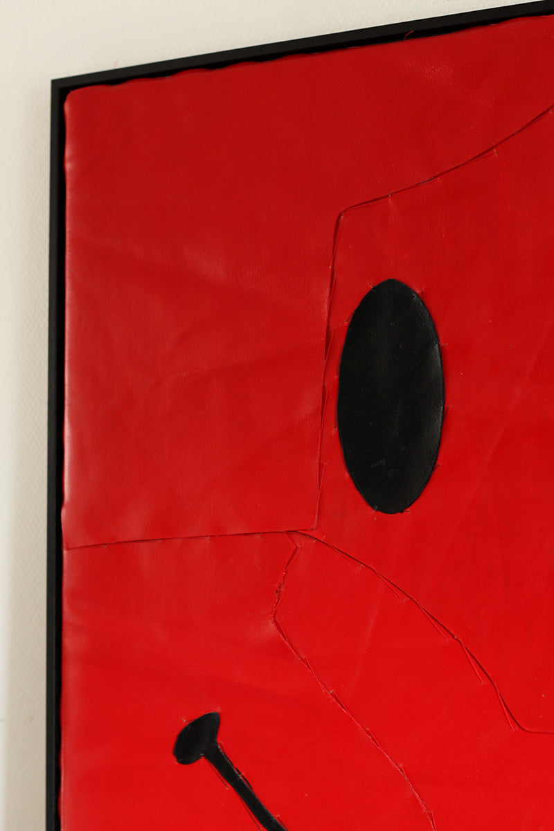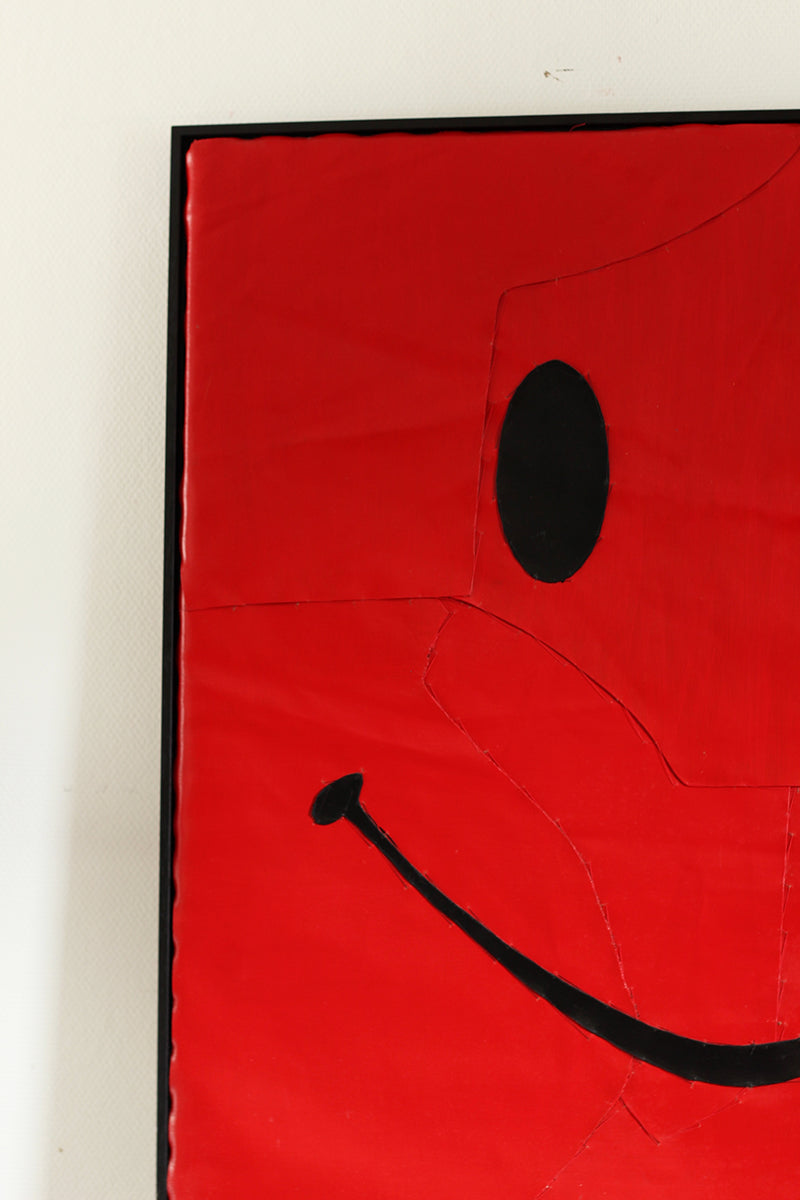 Breng een glimlach op je gezicht met Just Smile, een vrolijk kunstwerk van Yaël Romeo Patrice Scope. Dit 100 x 100 cm grote stuk, gemaakt van geverfd leer dat op canvas is gestikt, voegt een speelse en unieke touch toe aan jouw interieur.