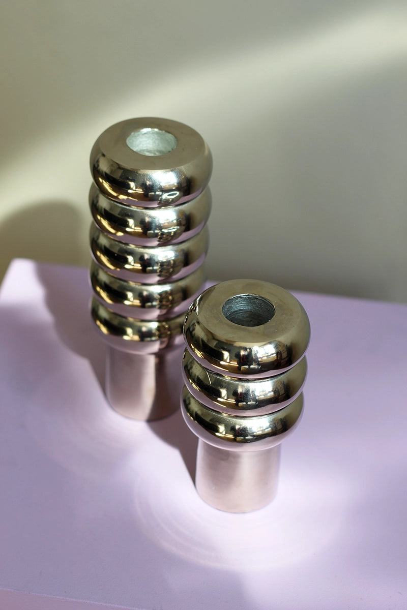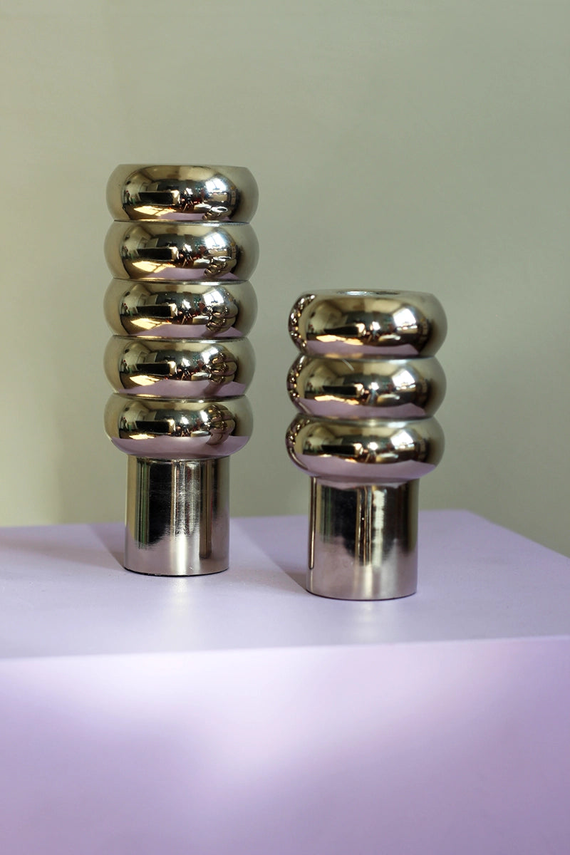 Shiny, stylish & straight-up chic. Deze metallic kandelaars in chrome zijn er in twee maten en geven direct een futuristische twist aan je interieur. Mix & match voor een speelse look of ga voor die minimal glow met één pronkstuk.