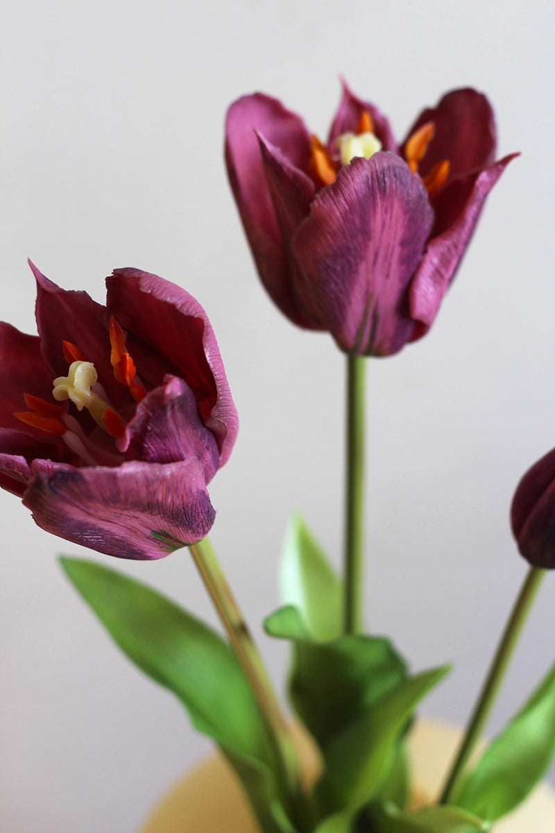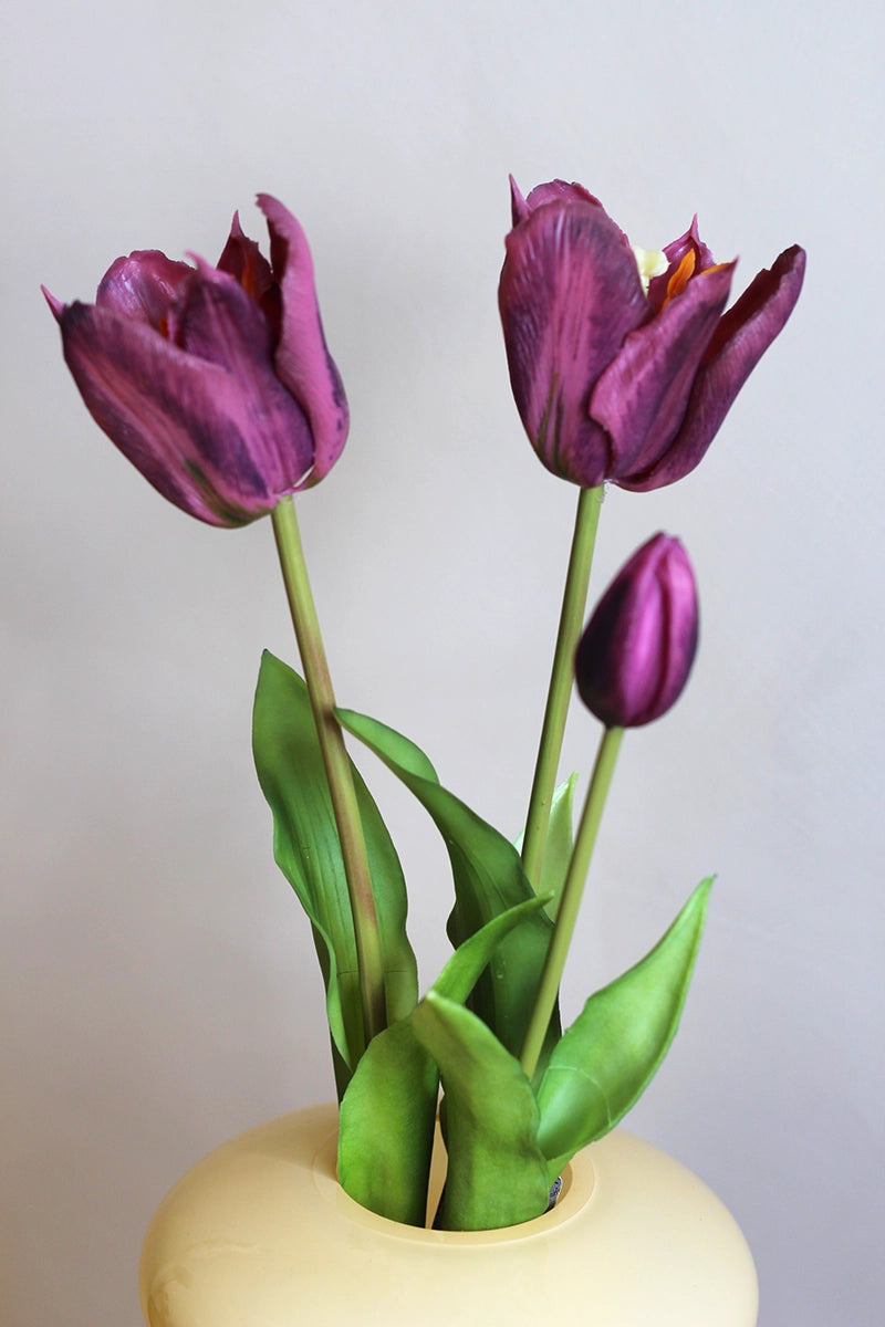 Niet van echt te onderscheiden, maar wel altijd in bloei. Deze nep tulpen in een rijke burgundy kleur zijn een elegante aanvulling op elke vaas – en extra mooi in combinatie met de botergele organic vaas van Present Time.