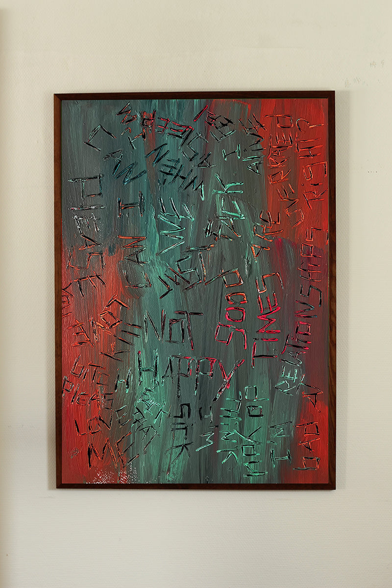 Maak kennis met Not Happy, een intrigerend kunstwerk van Yaël Romeo Patrice Scope. Met een afmeting van 50 x 70 cm en vervaardigd uit acryl op papier, speelt dit stuk met gradiënt kleuren en krachtige teksten.