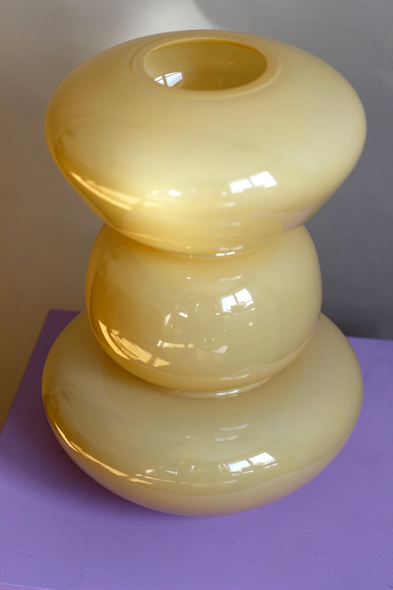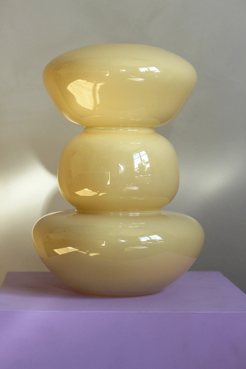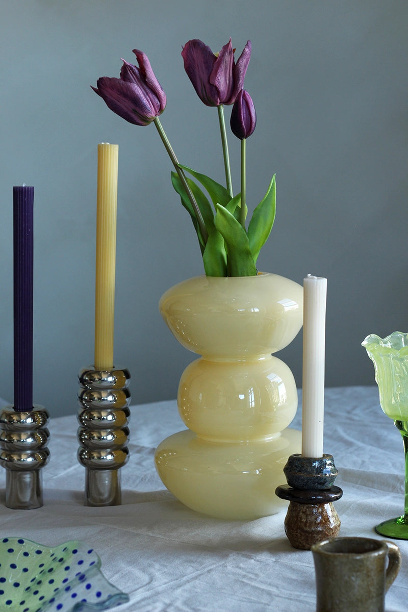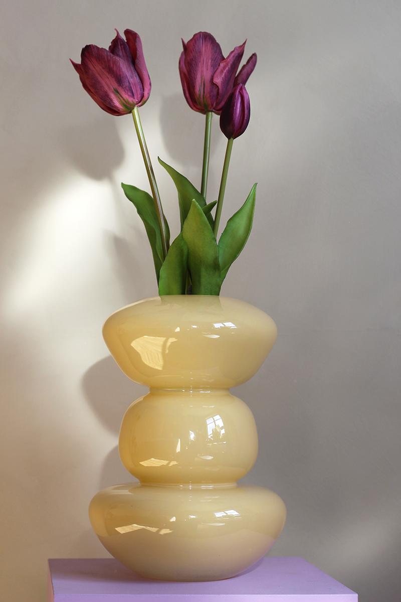 Deze botergele vaas van Present Time is een echte showstopper. Drie organische vormen die als het ware op elkaar zijn gestapeld tot een sculpturaal geheel. Perfect te combineren met de nep tulpen voor een kleurrijke en eigentijdse look.