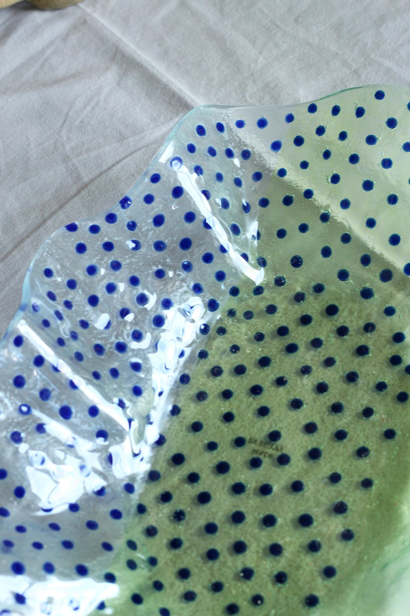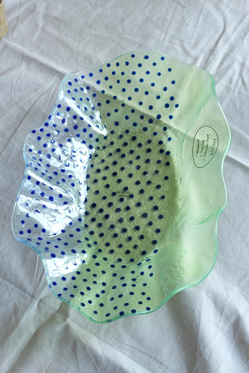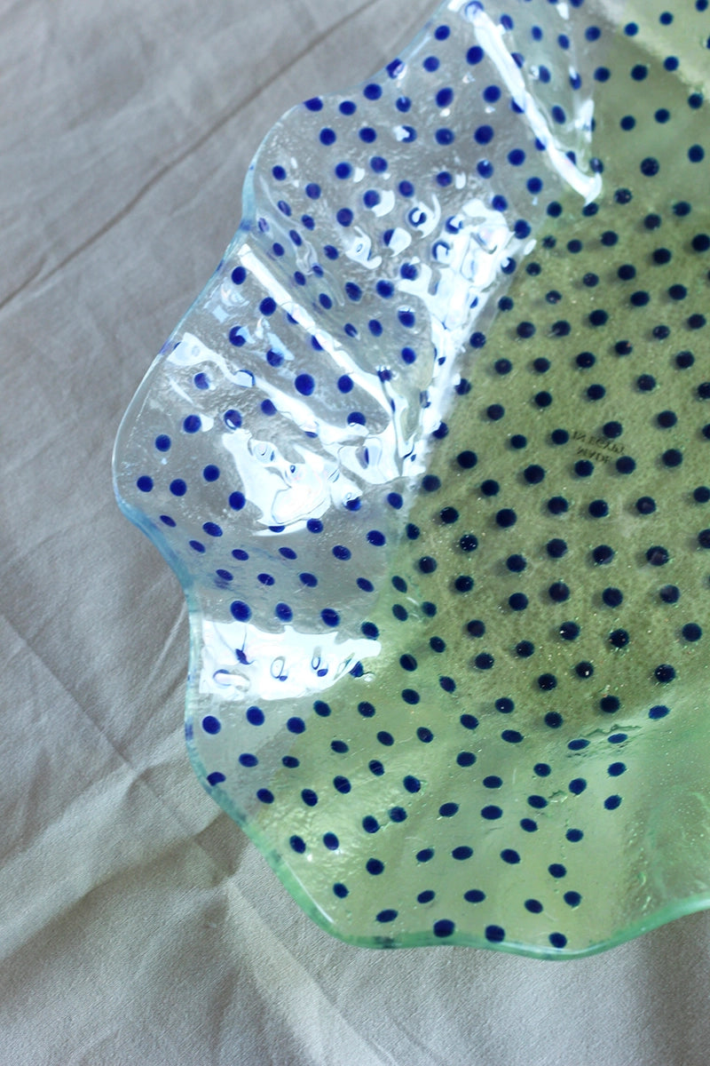 Deze wavy schaal van handgeblazen glas is allesbehalve basic. Lichtgroen glas met een verrassend gestippeld detail maakt ‘m een eyecatcher voor elke setting. Van een stylish fruitschaal tot een feestelijke serveerschaal – jij kiest de vibe.